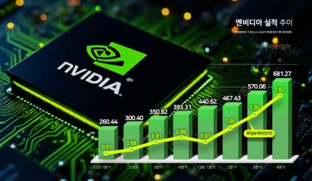 세계 시가총액 1위 기업인 엔비디아(NVIDIA)가 또 한 번 분기 기준 최대 매출을 기록했다. 엔비디아는 25일(현지시간) 회계연도 4분기(2025년 11월~2026년 1월) 매출이 681억3000만 달러(약 98조원)로 집계됐다고 공시했다. 이는 전년 동기 대비 73% 증가한 수치다. 시장조사업체 LSEG가 집계한 전망치(662억 달러)도 상회했다. 사업 부문별로는 데이터센터 부문이 623억 달러의 매출을 기록하며 전체 실적을 견인했다. 전체 매출의 대부분이 데이터센터 부문에서 발생한 것으로 나타났다. 같은 기간 조정 주당순이익(EPS)은 1.62달러로, 월가 예상치(1.53달러)를 웃돌았다. 연간 매출도 증가세를 이어갔다. 엔비디아의 2025회계연도 전체 매출은 2159억 달러(약 312조원)로 전년 대비 65% 늘었다. 연간 기준으로도 역대 최고치다. 엔비디아는 2026회계연도 1분기(2~4월) 매출 전망치를 780억 달러로 제시했다. 이는 시장 컨센서스(726억 달러)를..