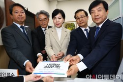 전현희 더불어민주당 사법불신 극복·사법행정 정상화 TF 위원장과 의원들이 3일 국회 의안과에서 사법행정 정상화 3법을 제출하고 있다.