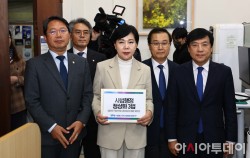 전현희 더불어민주당 사법불신 극복·사법행정 정상화 TF 위원장과 의원들이 3일 국회 의안과에서 사법행정 정상화 3법을 제출하고 있다. 왼쪽부터 김승원, 김기표 의원, 전 위원장, 이건태, 김성윤 의원