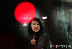 이진숙 방송통신위원장이 28일 국회 소통관에 방송미디어통신위원회 설치법 통과에 따른 입장을 밝힌 뒤 소통관을 나서고 있다.