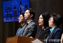 최민희 국회 과학기술정보방송통신위원장과 더불어민주당, 조국혁신당 과방위원들이 28일 국회 소통관에서 방송미디어통신위원회 설치법 의결 관련 기자회견을 하고 있다.