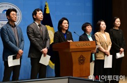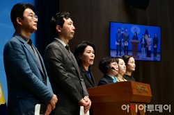 최민희 국회 과학기술정보방송통신위원장과 더불어민주당, 조국혁신당 과방위원들이 28일 국회 소통관에서 방송미디어통신위원회 설치법 의결 관련 기자회견을 하고 있다. 왼쪽부터 노종면, 이정헌 더불어민주당 의원, 최 위원장, 김현, 이주희 더불어민주당 의원, 이해민 조국혁신당 의원.