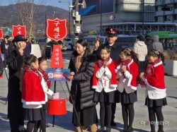 28일 서울 광화문광장에서 열린 구세군 시종식 이후 자선냄비에 기부하는 어린이들과 학부모. 이날 구세군 시종식에는 김병윤 사령관, 대통령비서실 전성환 경청통합수석, 오세훈 서울시장, 서영교 더불어민주당 국회의원, 문화체육관광부 김도형 종무실장, 한국기독교교회협의회(NCCK) 박승렬 총무, CBS기독교방송 나이영 사장 등이 참석했다.,