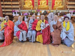 서울 종로구 광화문 태고종 법륜사에서 1일 열린 제17대 주지 성파당 혜각스님(아래 사진) 진산식(취임식) 단체 기념촬영./사진=황의중 기자