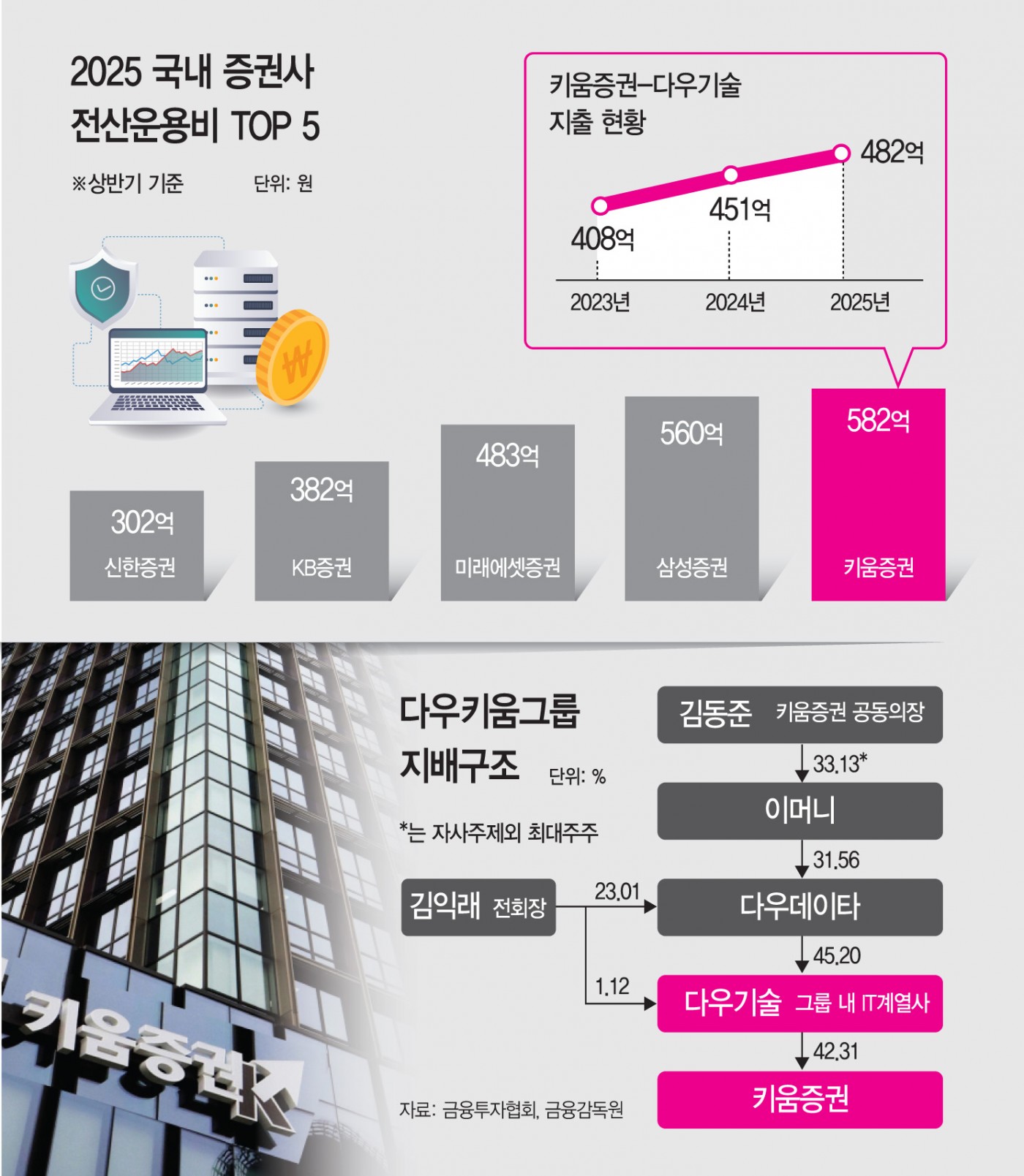 키움증권이 업계 최대 수준의 전산운용비를 지출하고도 잇따른 시스템 장애가 발생하면서 비용 효율성에 대한 우려가 커지고 있다. 키움증권은 모회사인 다우기술에 전산운용을 맡겨 다른 증권사들보다 전산비용 지출이 상대적으로 높은 편이다. 다우기술은 다우키우그룸의 IT계열사로, 지배구조 최상위에는 김익래 전 다우키움그룹 회장의 장남인 김동준 키움인베스트먼트·키움프라이빗에쿼티(PE) 대표가 있다.