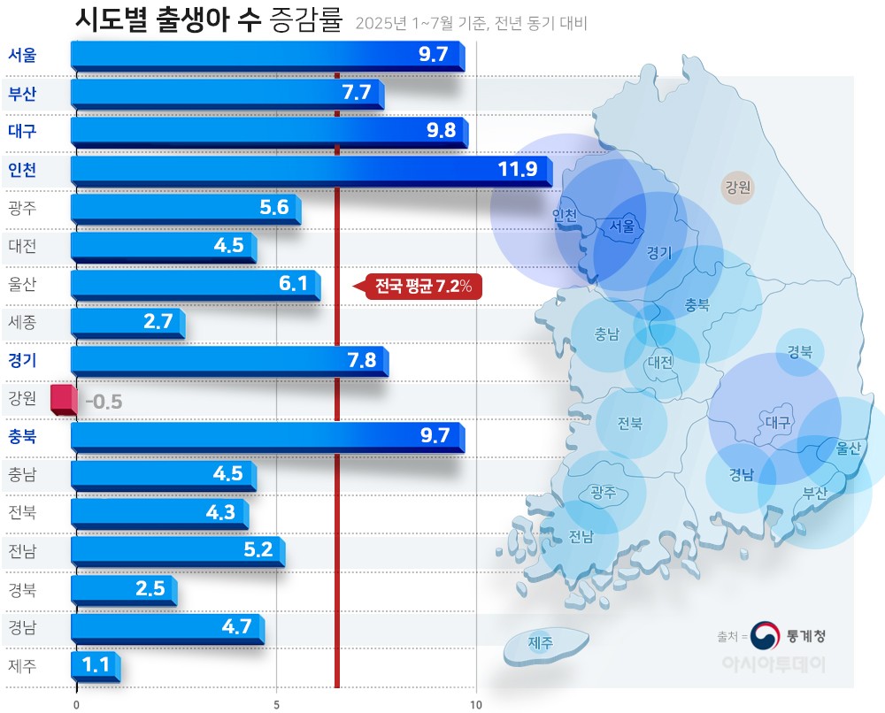 전국 대부분 지역에서 출생아 수가 늘었으나, 증가 속도는 지역별로 차이를 보였다.
