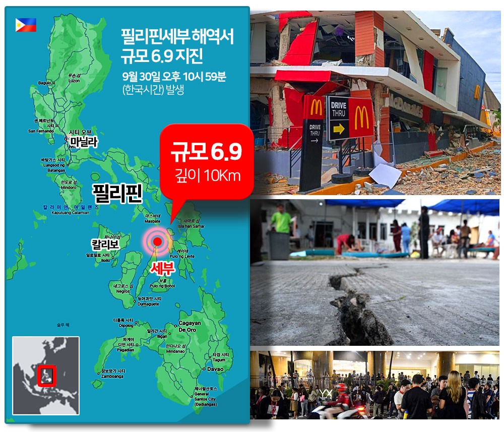 지진은 필리핀 현지시각 오후 9시 59분에 발생했으며, 진앙은 보고(Bogo) 북동쪽 약 17km 해역으로 추정된다.