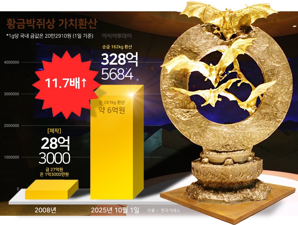 황금박쥐상은 2008년 만들어졌다. 제작 당시 금 27억원, 은 1억3000만원 등 재료가격만 28억3000만원이 들어가 혈세 낭비라는 비판을 받았다. 하지만 이후 금값과 은값이 계속 오르면서 재평가 받고 있다.