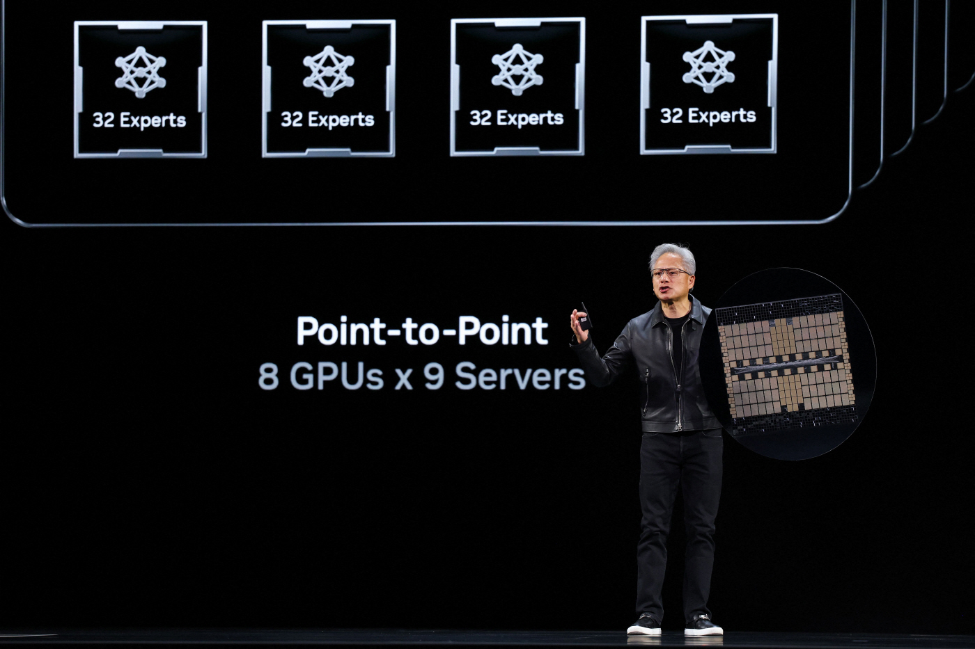 젠슨 황 엔비디아 최고경영자(CEO)가 28일(현지시간) 미국 워싱턴D.C.에서 열린 자사 콘퍼런스 'GTC 2025'에서 제품을 소개하고 있다. /AFP 연합