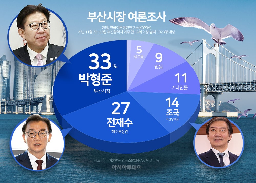 26일 한국여론평판연구소(KOPRA)가 자체적으로 지난 11월 22~23일 부산광역시 거주 만 18세 이상 남녀 1023명을 대상으로 실시한 조사에 이 같은 결과가 나왔다.