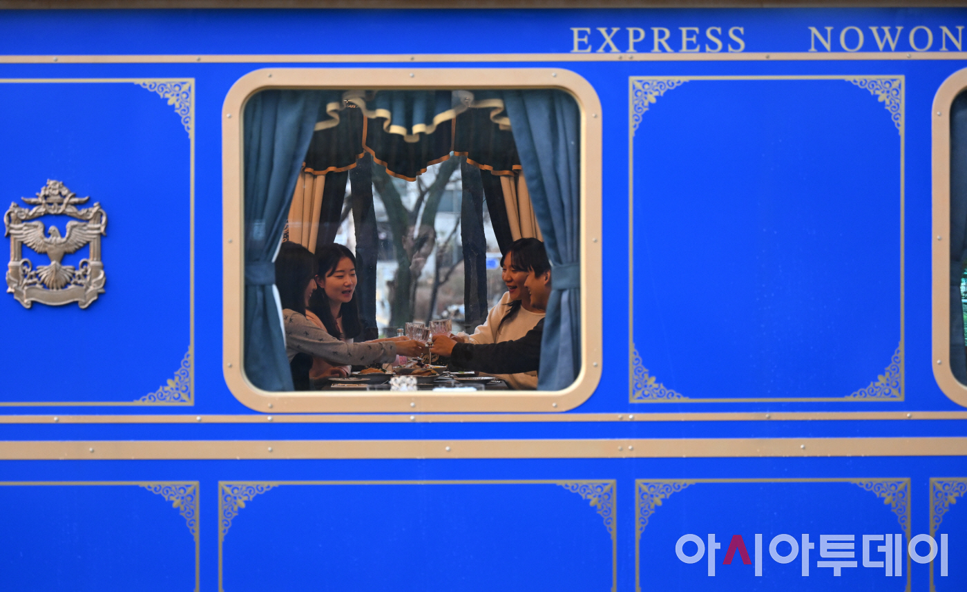 27일 서울 노원구 공릉동 화랑대철도공원 내 유럽풍 특급열차 레스토랑 ‘익스프레스 노원 by 미라쥬’에서 시식 평가단이 개장 전 메뉴를 시식하고 있다. ‘익스프레스 노원 by 미라쥬’ 1량은 영화 세트 전문가가 특수 제작하고 1량은 무궁화호 객차를 리모델링해 주방 및 운영 공간으로 구성했다. 내부는 정교한 문양과 샹들리에, 유럽풍 소품으로 꾸며져 특급열차의 화려한 감성을 그대로 담아냈다. 레스토랑에서는 ‘태릉솔밭 갈비 파스타’, ‘불암산 리조또’ 등 노원만의 특색을 담은 메뉴를 선보일 예정이며, 지역 상권 활성화와 지역 명소화를 위해 로컬 브랜드 사업자와의 협업을 통해 운영한다. /정재훈 기자