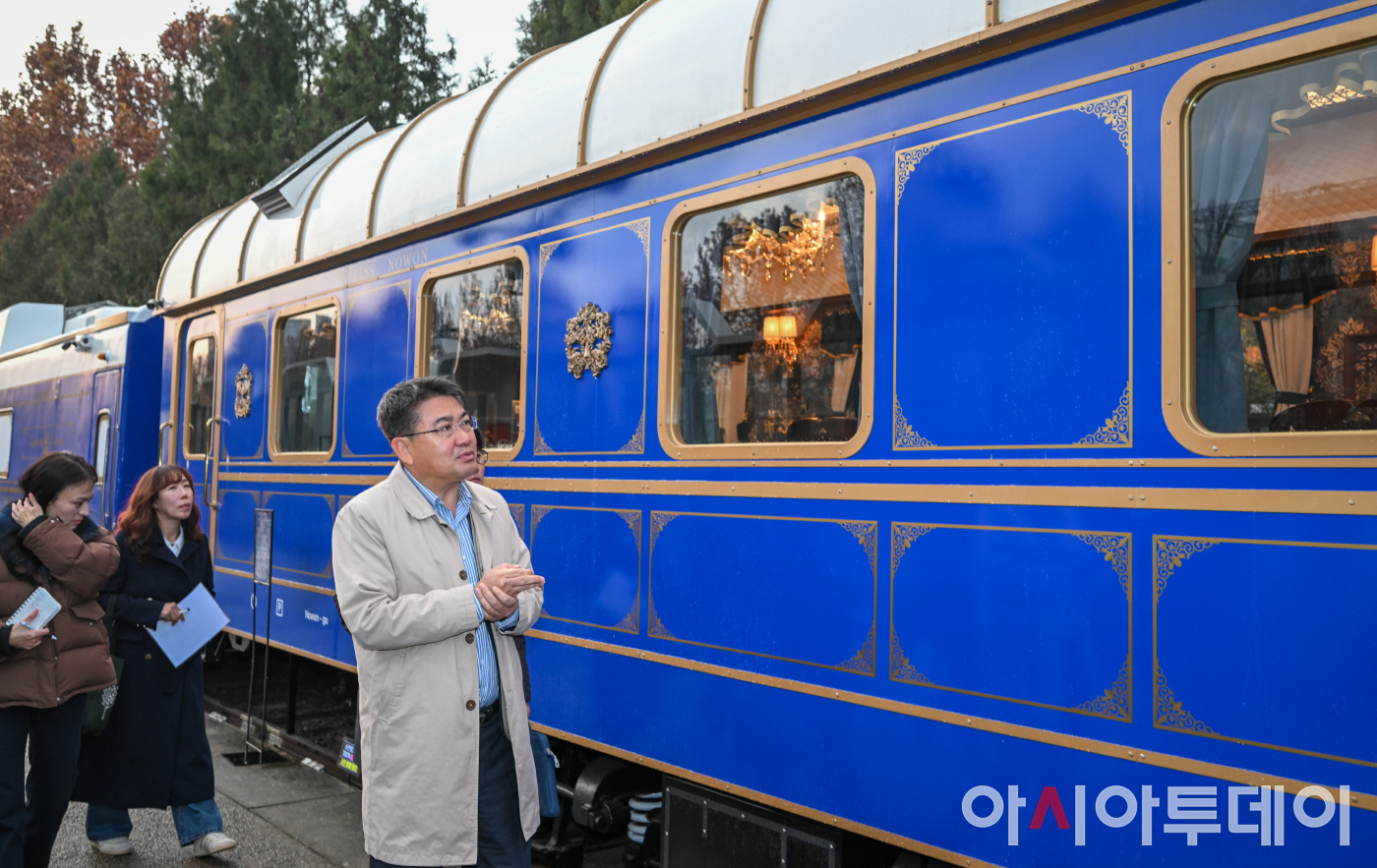 오승록 노원구청장이 27일 오후 서울 노원구 공릉동 화랑대철도공원 내 개장 예정인 유럽풍 특급열차 레스토랑 ‘익스프레스 노원 by 미라쥬’를 찾아 관계자들과 함께 현장점검을 하고 있다. ‘익스프레스 노원 by 미라쥬’ 1량은 영화 세트 전문가가 특수 제작하고 1량은 무궁화호 객차를 리모델링해 주방 및 운영 공간으로 구성했다. 내부는 정교한 문양과 샹들리에, 유럽풍 소품으로 꾸며져 특급열차의 화려한 감성을 그대로 담아냈다. 레스토랑에서는 ‘태릉솔밭 갈비 파스타’, ‘불암산 리조또’ 등 노원만의 특색을 담은 메뉴를 선보일 예정이며, 지역 상권 활성화와 지역 명소화를 위해 로컬 브랜드 사업자와의 협업을 통해 운영한다. /정재훈 기자