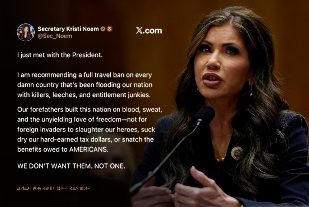 놈 장관은 엑스(X·옛 트위터)를 통해 일부 이민자들을 "살인자", "흡혈귀"라고 표현하며 미국 사회와 재정을 위협한다고 주장했다. 또 "권리만 요구하는 무임승차자를 쏟아붓는 모든 나라에 대해 전면적인 여행 금지를 제안한다"며 "우리는 그들을 원하지 않는다. 단 한 명도"라고 밝혔다.