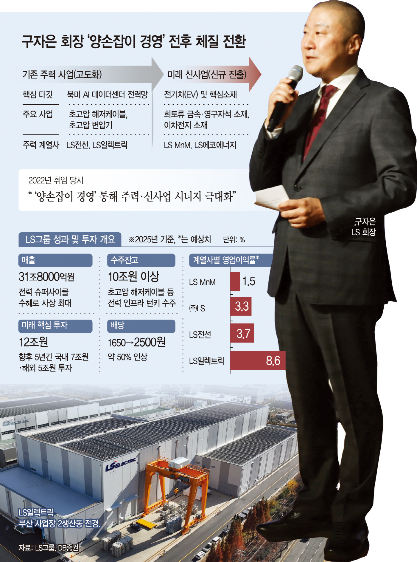 이러한 수익성 한계를 극복하기 위한 체질 전환의 밑바탕에는 구자은 LS 회장의 뚝심이 자리한다. 구 회장은 2022년 취임 일성으로 "한 손에는 전기·전력 등 기존 주력 사업의 탄탄한 기술력을 쥐고, 다른 한 손에는 미래 신사업을 쥐어 균형 있게 시너지를 극대화하겠다"며 이른바 '양손잡이 경영'을 선언한 바 있다. 취임 이후 대규모 투자를 거쳐 기존 사업과 신사업의 비중을 균형 있게 맞춰가는 구체적인 실적과 사업구조 개편으로 증명되고 있다.